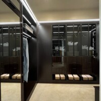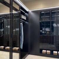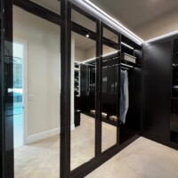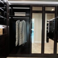 The welcoming three-paneled glass doors encased in wood frames give homeowners a peek of the custom walk-in closet’s contents. For this custom walk-in closet, two types of large doors were utilized – black aluminum and mirrored doors.