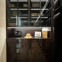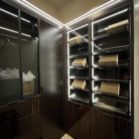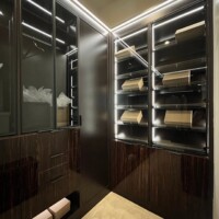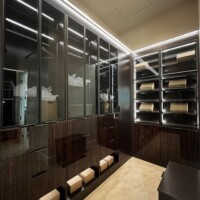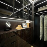 The shoe rack is guarded by glass doors in lacquered-wood frames that are consistent with the custom walk-in closet’s design. The same goes with the lighting system that gives this space a boutique feel. Functional, elegant, and stylish, anyone would be excited to dress up in such a delightful sight.