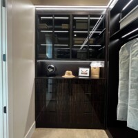 This custom walk in primary closet project is located in Bella Strada’s new home model Vinci. While the color palette gives off a traditional vibe, the design is unmistakably modern with the refined interior lighting system, glass doors, ample shelves, cabinetry, and other features!