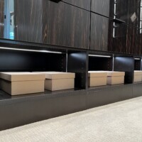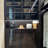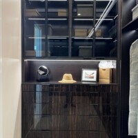 A staple furniture in custom closet systems is a dresser drawer where folded items can be neatly tucked away. But our clients did not settle for less and instead upped the ante by placing stylish and functional storage furniture. The top half is a multi-layered storage shelf while the bottom half is an elegant dresser drawer. What makes this piece interesting is the lighted display chamber in the middle.