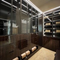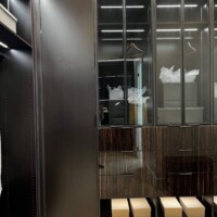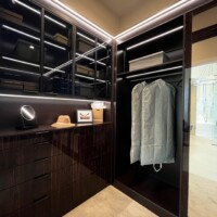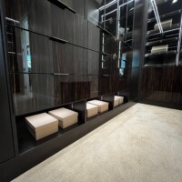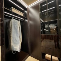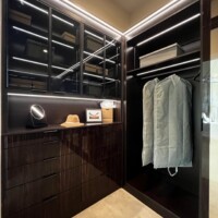 The shoe rack is guarded by glass doors in lacquered-wood frames that are consistent with the custom walk-in closet’s design. The same goes with the lighting system that gives this space a boutique feel. Functional, elegant, and stylish, anyone would be excited to dress up in such a delightful sight.