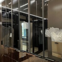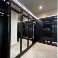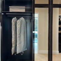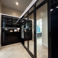 The welcoming three-paneled glass doors encased in wood frames give homeowners a peek of the custom walk-in closet’s contents. For this custom walk-in closet, two types of large doors were utilized – black aluminum and mirrored doors.